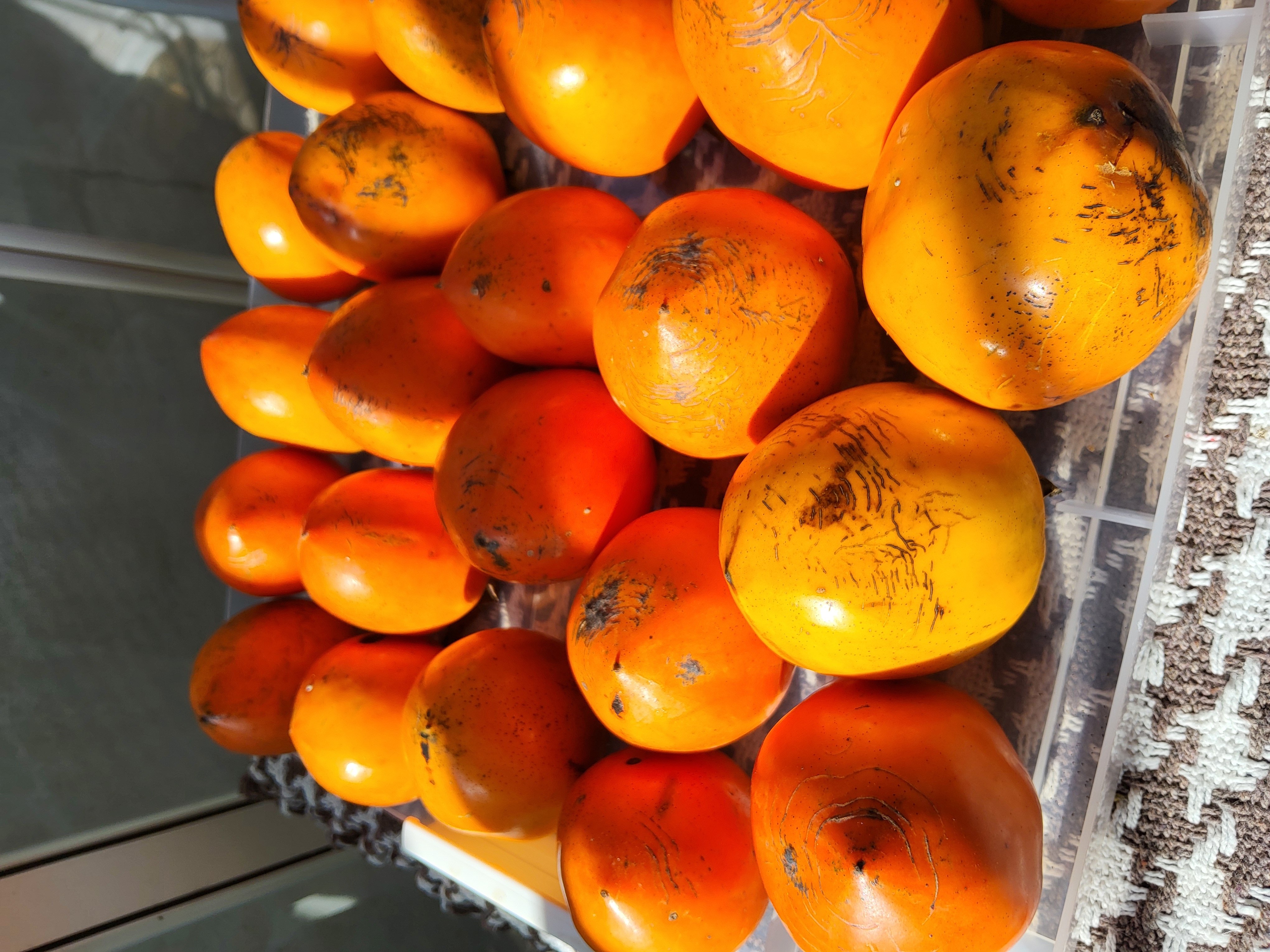 대나무 장대로 딴 감은 은행잎이 노랗게 변해가는 동안 선홍빛 홍시로 변해간다 걷어들인 자두같이 큰 대추와 말랑말랑한 무화과, 두꺼운 껍질이 벌어진 검은씨가 콕콕 박힌 하얀 으름과 단감은 빨간 햇살과 배부른 바람과 같이 창고에 차곡차곡 쌓여간다